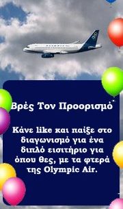 Η Olympic Air διοργανώνει διαγωνισμό και σας δίνει τη δυνατότητα να κερδίσετε ένα διπλό εισιτήριο (εσωτερικού ή εξωτερικού) μετ’ επιστροφής σε όποιον προορισμό επιθυμείτε.