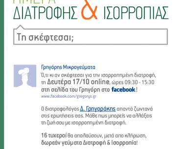 Τα Γρηγόρης Μικρογεύματα διοργανώνου διαγωνισμό και σας δίνουν τη δυνατότητα να κερδίσετε 16 δωρεάν γεύματα Διατροφή & Ισορροπία και Online συζήτηση με το διατροφολόγο Δ. Γρηγοράκη.