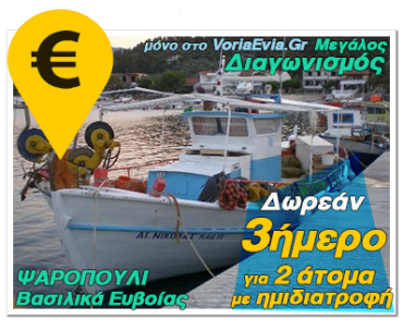 Ο τουριστικός οδηγός voriaevia.gr διοργανώνει διαγωνισμό και σας δίνει τη δυνατότητα να κερδίσετε 2 διανυκτερεύσεις για όποιο Σαββατοκύριακο του Ιουνίου θέλετε στo Ψαροπούλι Βασιλικών στην Εύβοια με ημιδιατροφή για 2 άτομα!