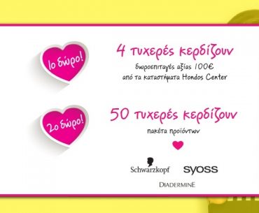 Tα Hondos Center διοργανώνουν διαγωνισμό και δίνουν τη δυνατότητα σε 4 τυχερούς να κερδίσουν από μία δωροεπιταγή αξίας 100€ από τα καταστήματα και σε ακόμη 50 πακέτα προϊόντων Schwarzkopf, Syoss και Diadermine!