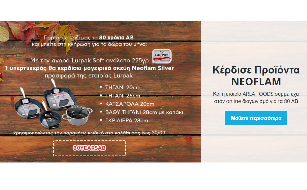 Άμεση συμμετοχή σε διαγωνισμό με δώρα: 80 6ευρες επιταγές ΑΒ Plus, μαγειρικά σκεύη Neoflam Silver προσφορά της εταιρείας Lurpak, 80 πόντους ΑΒ Plus, με τη χρήση του κωδικού “80YEARSAB” στην checkout page κάθε παραγγελίας!