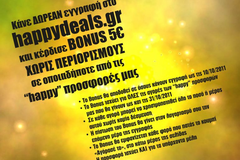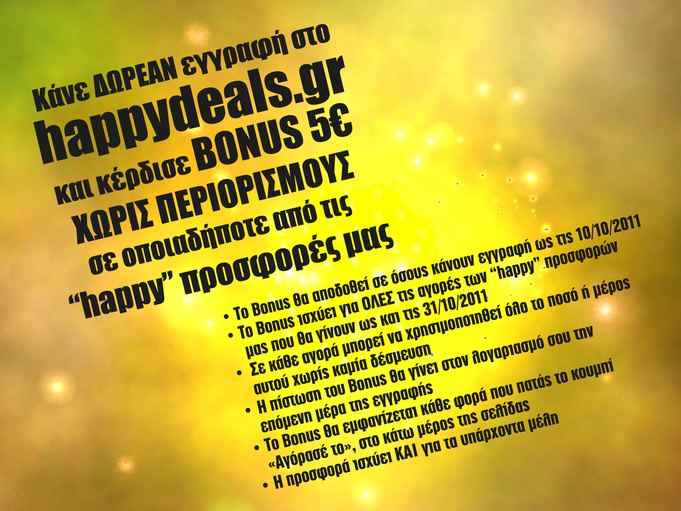 Το Happydeals.gr σας πρσφέρει Bonus 5€ σε οποιαδήποτε από τις προσφορές του, μόνο με την εγγραφή σας.