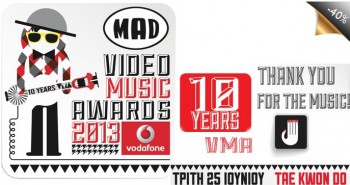Ο μοναδικός ελληνικός μουσικός θεσμός των Mad Video Music Awards 2013 by Vodafone συμπληρώνει 10 χρόνια και το γιορτάζει μ’ ένα ανατρεπτικό μουσικό θέαμα! O cheapis.gr σας δίνει την ευκαιρία να εξασφαλίστε τα εισιτήρια σας & να παρακολουθήστε το επετειακό show από το οποίο θα παρελάσουν πολλοί αγαπημένοι καλλιτέχνες με εντυπωσιακά acts, την Τρίτη 25/6 στο κλειστό γήπεδο Tae Kwon Do, με εισιτήριο εισόδου για 1 άτομο, μόνο 9€ (αξίας 15€ – έκπτωση 40%).
