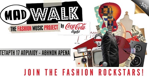 Το cheapis.gr σας δίνει την ευκαιρία να παρακολουθήστε το MadWalk by Coca-Cola light, που έρχεται για 3η συνεχή χρονιά! Εξασφαλίστε τα εισιτήρια σας και παρακολουθήστε κορυφαίους σχεδιαστές & δημοφιλείς καλλιτέχνες να ενώνονται σε ένα ξεχωριστό Fashion Music Project στο Αθηνών Αρένα την Τετάρτη 17 Απριλίου! Εισιτήριο εισόδου για 1 άτομο, μόνο 7,5€ (αξίας 15€ – έκπτωση 50%).