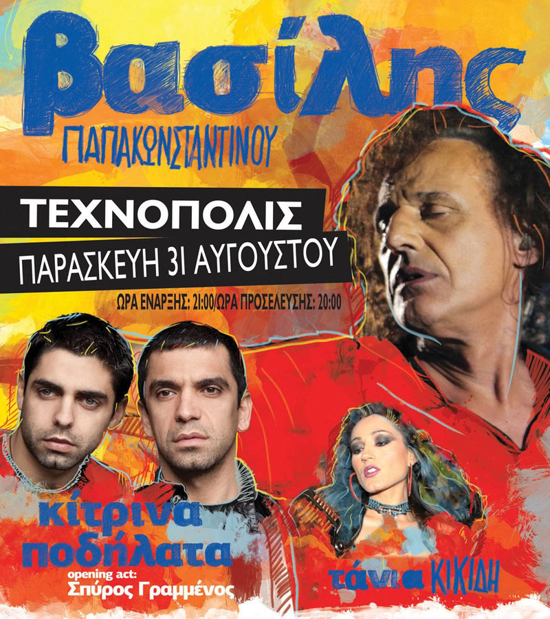 Το Viva.gr σας προσφέρει εισιτήρια για τη συναυλία του Βασίλη Παπακωνσταντίνου και των Κίτρινα Ποδήλατα την Παρασκευή 31 Αυγούστου στις 21:00 στην «Τεχνόπολις» Δήμου Αθηναίων με μόλις 10 Ευρώ.