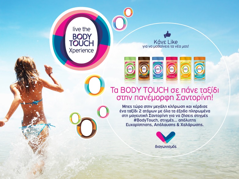 Η Body Touch διοργανώνει διαγωνισμό και δίνει τη δυνατότητα σε ένα τυχερό να κερδίσει ένα ταξίδι στη Σαντορίνη για 2 άτομα με πληρωμένα τα μεταφορικά και 2 διανυκτερεύσεις και σε 20 ακόμα από ένα σετ της προτίμισής τους με αφρόλουτρο και λοσιόν σώματος!