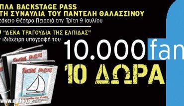 Το Ogdoo.gr γιορτάζει τα 10.000 μέλη στη σελίδα του στο Facebook και χαρίζει 10 όμορφα, διαφορετικά δώρα στους αναγνώστες του! Τρεις τυχεροί θα κερδίσουν από ένα διπλό backstage πάσο για να παρακολουθήσουν τη συναυλία του Παντελή Θαλασσινού στο Βεάκειο Θέατρο Πειραιά την Τρίτη 9 Ιουλίου 2013, να γνωρίσουν από κοντά τον αγαπημένο τραγουδοποιό & να φωτογραφηθούν μαζί του! Αλλά και εφτά ακόμα φίλοι μας από οποιαδήποτε πόλη της Ελλάδας, θα κερδίσουν από ένα αντίτυπο του νέου CD του Παντελή Θαλασσινού «10! Τραγούδια της Ελπίδας» με προσωπική αφιέρωση!