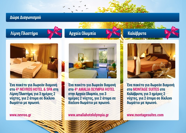 Το ekdromi.gr διοργανώνει διαγωνισμό και σας δίνει τη δυνατότητα να κερδίσετε 3 πακέτα διαμονής: Αρχαία Ολυμπία, Πιερία & Αχαΐα!