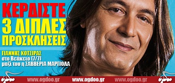 Το Ogdoo.gr εξασφάλισε για τους αναγνώστες του δύο διπλές προσκλήσεις για τη συναυλία της Εστουδιαντίνας Νέας Ιωνίας με το Γιάννη Κότσιρα, στην Τεχνόπολη, την Πέμπτη 06 Σεπτεμβρίου 2012.Το Ogdoo.gr εξασφάλισε για τους αναγνώστες του δύο διπλές προσκλήσεις για τη συναυλία της Εστουδιαντίνας Νέας Ιωνίας με το Γιάννη Κότσιρα, στην Τεχνόπολη, την Πέμπτη 06 Σεπτεμβρίου 2012.