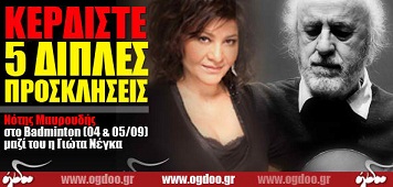 Το Ogdoo.gr εξασφάλισε για τους αναγνώστες του πέντε διπλές προσκλήσεις για κάθε συναυλία του Νότη Μαυρουδή με τη Γιώτα Νέγκα & τον Χρήστο Κωνσταντόπουλο, στο προαύλιο του Badminton, στις 4 & 5 Σεπτεμβρίου.