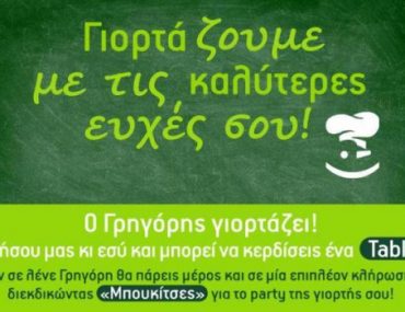 Η σελίδα Γρηγόρης Μικρογεύματα διοργανώνει διαγωνισμό και σας δίνει τη δυνατότητα να κερδίσετε ένα επώνυμο tablet αξίας μέχρι και 250€ και 3 menu «Μπουκίτσες» για πάρτι 20 ατόμων.