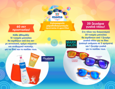 Η σελίδα ΔΕΛΤΑ moms διοργανώνει διαγωνισμό και δίνει τη δυνατότητα σε 15 τυχερούς κάθε εβδομάδα να κερδίσουν από ένα σετ προστασίας Mustela, το οποίο αποτελείται από ένα ισοθερμικό τσαντάκι, ένα αντηλιακό και μια κρέμα σώματος. Επιπλέον, στη μεγάλη κλήρωση 20 τυχεροί θα κερδίσουν από ένα ζευγάρι γυαλιά ηλίου από τα Mark Aalen για τη μητέρα και το παιδί.