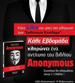 18-01-2013 Διαγωνισμός Εκδόσεις Κονιδάρη με δώρο 5 βιβλία Anonymous Οι Εκδόσεις Κονιδάρη διοργανώνουν διαγωνισμό και σας δίνουν τη δυνατότητα να κερδίσετε 5 βιβλία Anonymous. Περισσοτερα...