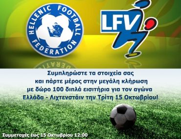 Η ΕΠΟ διοργανώνει διαγωνισμό και σας δίνει τη δυνατότητα να κερδίσετε 100 διπλά εισιτήρια για τον αγώνα Ελλάδα-Λιχτενστάιν την Τρίτη 15/10/2013 και ώρα 20:00 στο γήπεδο «Γ. Καραϊσκάκης».