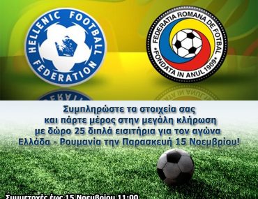 Η ΕΠΟ διοργανώνει διαγωνισμό όπου 25 τυχεροί κερδίζουν από ένα διπλό εισιτήριο για τον αγώνα της Ελλάδα Ρουμανία την Παρασκευή 15 Νοεμβρίου!