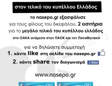 Το nasepo.gr διοργανώνει διαγωνισμό και σας δίνει τη δυνατότητα να κερδίσετε 2 εισιτήρια για το μεγάλο τελικό του κυπέλλου Ελλάδος στο ΟΑΚΑ ανάμεσα στον ΠΑΟΚ και τον Παναθηναϊκό!