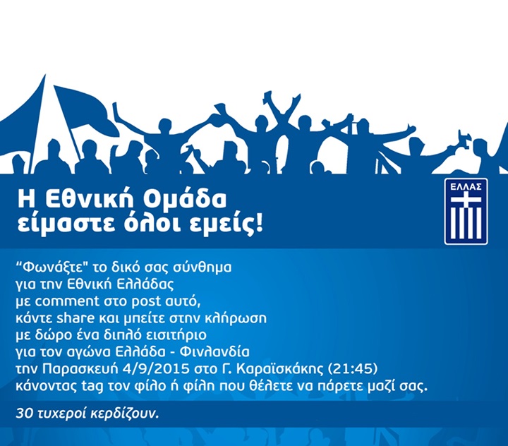H ΕΠΟ διοργανώνει διαγωνισμό και δίνει τη δυνατότητα σε 30 τυχερούς να κερδίσουν από ένα διπλό εισητήριο για τον αγώνα Ελλάδα – Φινλανδία, την Παρασκευή 4/9/2015 στο Γ. Καραϊσκάκης! Η Εθνική Ομάδα είμαστε όλοι εμείς!