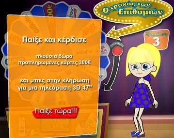 Η σελίδα Επιθυμίες διοργανώνει το διαγωνισμό «O Τροχός των Επιθυμιών» με μεγάλο δώρο μια τηλεόραση 3D, 47”. Επιπλέον κατά την διάρκεια του διαγωνισμού θα δοθούν δύο χιλιάδες τριακόσια δεκατέσσερα δώρα (2.314).