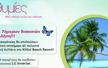 Οι epithimies.gr διοργανώνουν καλοκαιρινό διαγωνισμό και σας κάνουν δώρο τέσσερα επταήμερα πακέτα οικογενειακών διακοπών για 4 άτομα (2 ενήλικες και 2 ανήλικα τέκνα) στο Κυλλήνη Beach Resort (συμπεριλαμβάνεται η διατροφή) και τέσσερα κλιματιστικά LG inverter.