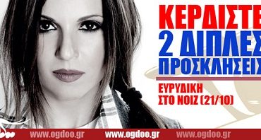 Tο Ogdoo.gr εξασφάλισε για τους αναγνώστες του δύο διπλές προσκλήσεις με κρασί ή μπύρα για τη συναυλία της Ευρυδίκης στο Noiz Club, στις 21 Οκτωβρίου 2012.