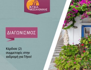 Το ΚΤΕΛ Θεσσαλονίκης Travel Agency διοργανώνει διαγωνισμό και σας δίνει τη δυνατότητα να κερδίσετε την συμμετοχή σας στην εκδρομή στην Τήνο για 2 άτομα στις 25 – 28 Αυγούστου!