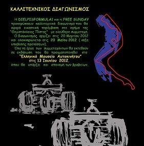 Η DielpisFormula1 και η Free Sunday προκηρύσσουν ανοιχτό καλλιτεχνικό διαγωνισμό που θα αφορά στην εικαστική παρέμβαση στο σχήμα της πίστας F1 που έχει προταθεί, στην περιοχή του λιμανιού του Πειραιά και στο Δήμο Δραπετσώνας αγώνες Formula1.
