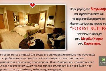 Η Audio Visual Entertainment διοργανώνει το διαγωνισμό “Έρωτας από την Αρχή” και σας δίνει τη δυνατότητα να κερδίσετε ένα ταξίδι για 2 άτομα που περιλαμβάνει 2 διανυκτερεύσεις στο “Forest Suites”, στο Μεγάλο Χωριό, στο Καρπενήσι στην κατηγορία executive rooms, με πρωινό.