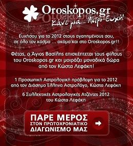 Ο Oroskopos.gr διοργανώνει το διαγωνισμό “Κάνε μία Άστρο-Ευχή” και σας δίνει τη δυνατότητα να κερδίσετε ένα (1) ραντεβού για προσωπική πρόβλεψη ή μια ανάλυση του αστρολογικού προφίλ από τον Κ.Λεφάκη με βάση τη διαθεσιμότητα του και έξι (6) ημερολόγια – ατζέντες του 2012 του Κώστα Λεφάκη με τίτλο «2012. Το έτος των μοιραίων αλλαγών» από τις εκδόσεις Λιβάνη.