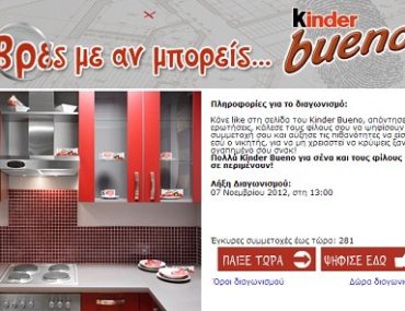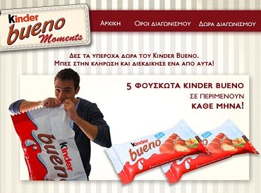 Η σελίδα Kinder Bueno Greece διοργανώνει το “Kinder Bueno Moments” και σας προσκαλεί να ψηφίσετε το Κinder Bueno moment σας και κάθε μήνα κληρώνει πέντε (5) νικητές, οι οποίοι κερδίζουν από ένα φουσκωτό μαξιλάρι Κinder Bueno.