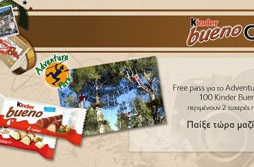To Κinder Bueno διοργανώνει το διαγωνισμό «Kinder Bueno Cities» και δίνει τη δυνατότητα σε 1 τυχερό να κερδίσει 100 Kinder Bueno για να τα μοιραστεί με την παρέα του και σε άλλον ένα να κερδίσει δωρεάν είσοδο στο Adventure Park μέχρι πέντε (5) άτομα.