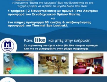 Η Κοινότητα facebook ‘’Βόλτα στο Λουτράκι‘’ διοργανώνει διαγωνισμό και σας δίνει τη δυνατότητα να κερδίσετε 1 τριήμερο (2 διανυκτερεύσεις με πρωινό) προσφορά του Ξενοδοχειακού Ομίλου Μαντά και ένα πλήρες πρόγραμμα 90΄ ευεξίας & αναζωογόνησης προσφορά του Thermal Spa Loutraki.