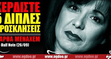 Το Ogdoo.gr εξασφάλισε για τους αναγνώστες του πέντε διπλές προσκλήσεις για τη συναυλία της Μάρθας Μεναχέμ με τη Μυρτώ Ναούμ & τον Μιχάλη Κωτσογιάννη στο Half Note Jazz Club, στις 26 Σεπτεμβρίου 2012.