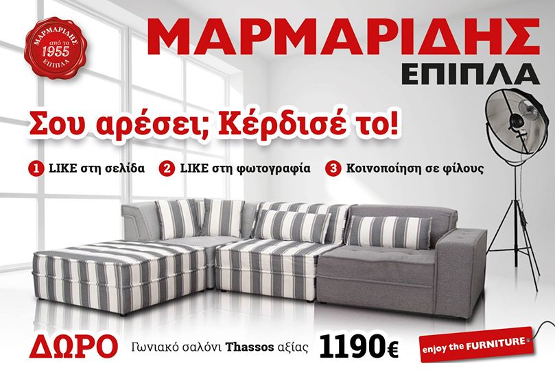 Τα Έπιπλα Μαρμαρίδης διοργανώνουν διαγωνισμό και σας δίνουν τη δυνατότητα να κερδίσετε ένα γωνιακό καναπέ 4 ανεξαρτήτων στοιχειών, συνολικής διάστασης 320Χ200 cm!