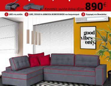 Τα Έπιπλα Μαρμαρίδης διοργανώνουν διαγωνισμό και σας δίνουν τη δυνατότητα να κερδίσετε ένα καναπέ γωνία Anna, αξίας 890€!
