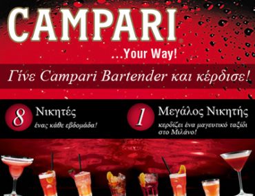 Η σελίδα Campari Greece διοργανώνει διαγωνισμό και σας καλεί να γίνετε Campari Bartender και να κερδίσετε! Ετοιμάστε το δικό σας cocktail με Campari, τραβήξτε βίντεο ή φωτογραφίες ενώ το προετοιμάζετε και στείλτε τα μαζί με τη συνταγή και τα υλικά που χρησιμοποιήσατε. Τα δώρα είναι: 8 συλλεκτικές φιάλες Campari Limited Edition 2012 με bartending kit και 1 3ήμερο ταξίδι στο Μιλάνο.
