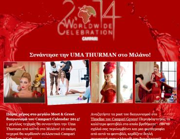 Η σελίδα του Campari διοργανώνει διαγωνισμό και σας δίνει τη δυνατότητα να κερδίσετε 1 ταξίδι στο Μιλάνο για να συναντήσετε την Uma Thurman και 10 συλλεκτικά Ημερολόγια Campari!