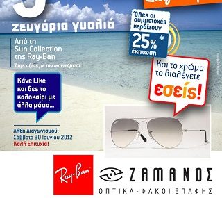Η σελίδα Οπτικά Ζαμάνος διοργανώνει διαγωνισμό και σας δίνει τη δυνατότητα να κερδίσετε 3 ζευγάρια γυαλιά Rayban Aviator.