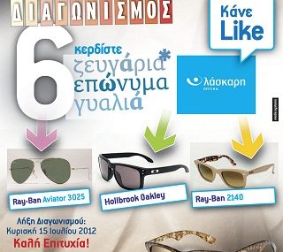 Τα Οπτικά Λάσκαρη διοργανώνουν διαγωνισμό και σας δίνουν τη δυνατότητα να κερδίσετε 6 ζευγάρια γυαλιά ηλίου. Τα δώρα είναι τρία ζευγάρια γυαλιά μετά από κλήρωση και τρία ζευγάρια γυαλιά για τους τρεις πρώτους που θα έχουν τις περισσότερες εγγραφές φίλων τους στο διαγωνισμό.
