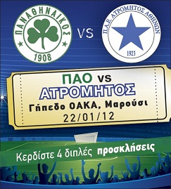 Ο Χρυσός Οδηγός διοργανώνει διαγωνισμό και σας δίνει τη δυνατότητα να κερδίσετε 4 διπλές προσκλήσεις για τον αγώνα ΠΑΟ – ΑΤΡΟΜΗΤΟΣ την Κυριακή 22/1 στο ΟΑΚΑ.