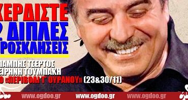 Το Ogdoo.gr εξασφάλισε για τους αναγνώστες του δύο διπλές προσκλήσεις με ποτό για τις εμφανίσεις του Μπάμπη Τσέρτου με την Ειρήνη Τουμπάκη στο Περιβόλι τ’ Ουρανού, στις 09 & 16 Νοεμβρίου 2012.