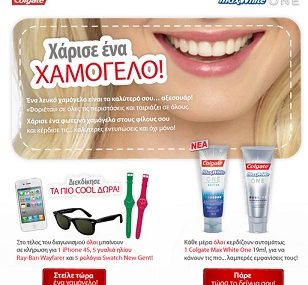 Η σελίδα Colgate Greece διοργανώνει διαγωνισμό και δίνει τη δυνατότητα σε 1 νικητή να κερδίσει ένα i-phone 4S, σε 5 νικητές να κερδίσουν από ένα ζευγάρι γυαλιών ηλίου Ray-ban Wayfarer και σε 5 ακόμα να κερδίσουν από ένα ρολόι χειρός Swatch New Gent.