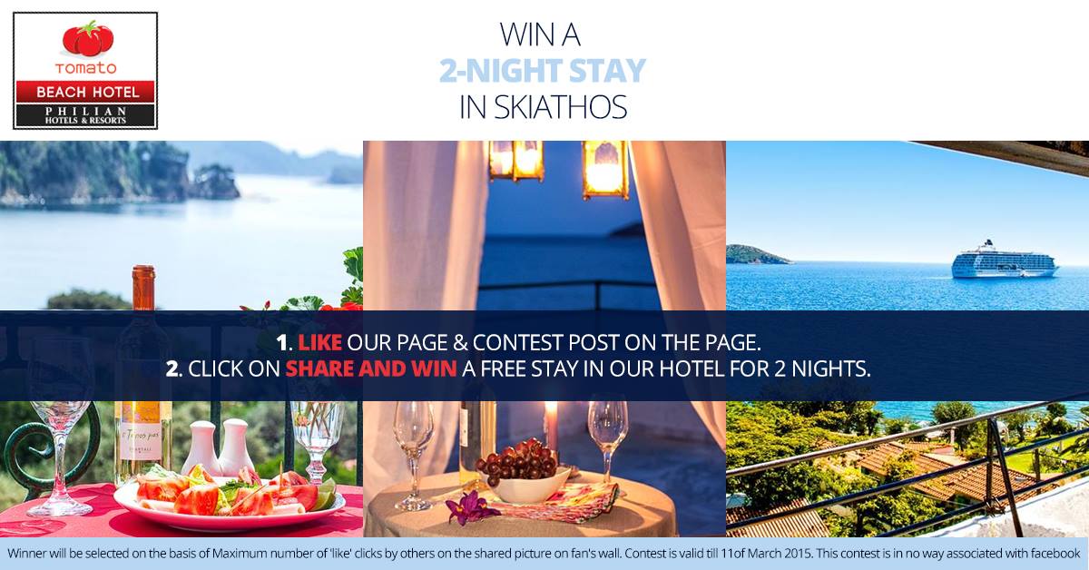 Το Thessvoice.gr σε συνεργασία με τον όμιλο ξενοδοχείων Philian Hotels & Resorts διοργανώνει διαγωνισμό με δώρο δύο διανυκτερεύσεις σε ένα από τα ξενοδοχεία Irida Hotel & Tomato Hotel στη Σκιάθο.