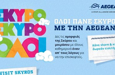 Η σελίδα AEGEAN AIRLINES διοργανώνει διαγωνισμό και δίνει τη δυνατότητα σε 1 τυχερό κάθε μέρα να κερδίσει 2 εισιτήρια, μετ΄ επιστροφής, σε οικονομική θέση, για τη διαδρομή Αθήνα – Σκύρο – Αθήνα.