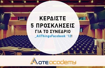Η σελίδα OTEAcademy διοργανώνει διαγωνισμό και σας δίνει τη δυνατότητα να κερδίσετε 5 προσκλήσεις για το συνέδριο AllThingsFacebook 2012. Μάθετε τα πάντα για το Facebook Marketing και το συναρπαστικό κόσμο των Social Media, στις σύγχρονες εγκαταστάσεις της OTEAcademy.