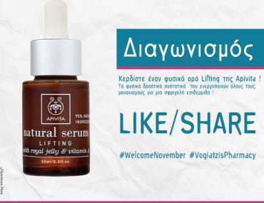 To Φαρμακείο Βοιατζή διοργανώνει διαγωνισμό και σας δίνει τη δυνατότητα να κερδίσετε ένα φυσικό ορό Lifting της Apivita που αναδομεί την επιδερμίδα μας με βασιλικό πολτό!