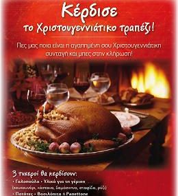 Ο ΑΒ Βασιλόπουλος διοργανώνει διαγωνισμό και δίνει τη δυνατότητα σε 3 τυχερούς να κερδίσουν από μία συλλογή προϊόντων που περιέχει: 1 φρέσκια γαλοπούλα Αμερικανικής Γεωργικής Σχολής Θεσσαλονίκης, Κουκουνάρι (50gr), Ponthier Βρασμένα κάστανα (400gr), AB Δαμάσκηνα (250gr), ΑΒ Σταφίδα Σουλτανίνα (200gr), ΑΒ Ρύζι παρμπόιλντ (500gr), Πατάτες (3kg), AB Νεμέα Ερυθρός Οίνος (750ml), Μικρές Πλαγιές Λευκός Οίνος (750ml) και 1 Βασιλόπιτα ή 1 Panettone.