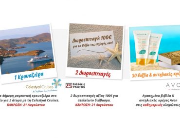 Οι εκδόσεις Ψυχογιός διοργανώνουν διαγωνισμό και σας δίνουν τη δυνατότητα να κερδίσετε μία 4ήμερη κρουαζιέρα, δωροεπιταγές για αγορές βιβλίων, 30 αντηλιακές κρέμες και 30 βιβλία σε έντυπη μορφή ή e-books!