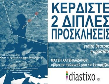 Το diastixo.gr, σε συνεργασία με την ομάδα AMOUR-AMOUR και τη Knot Gallery, προσφέρει στους αναγνώστες του 2 διπλές προσκλήσεις, για το έργο «ΜΑΤΣΗ ΧΑΤΖΗΛΑΖΑΡΟΥ – ΣΒΗΣΕ ΤΟ ΠΡΟΣΩΠΟ ΜΟΥ ΚΑΙ ΞΑΝΑΡΧΙΖΟΥΜΕ» (για την παράσταση της Τρίτης 29 Ιανουαρίου στις 21:00).