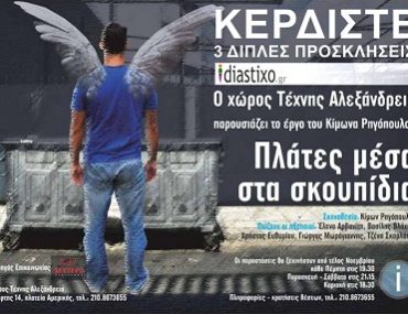 Το diastixo.gr, σε συνεργασία με το νέο χώρο τέχνης Αλεξάνδρεια, προσφέρει στους αναγνώστες του 3 διπλές προσκλήσεις, για το έργο του Κίμωνα Ρηγόπουλου Πλάτες μέσα στα σκουπίδια (για την παράσταση της Παρασκευής 22 Φεβρουαρίου στις 21:15).