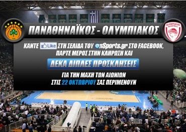 Το onsports.gr διοργανώνει διαγωνισμό και σας δίνει τη δυνατότητα να κερδίσετε 10 διπλές προσκλήσεις για τον αγώνα του Παναθηναϊκού ΚΑΕ ΑΟ εναντίον του Ολυμπιακού που θα λάβει χώρα τη Δευτέρα 22 Οκτωβρίου 2012 στις 18:45 στο ΟΑΚΑ.